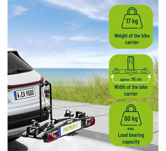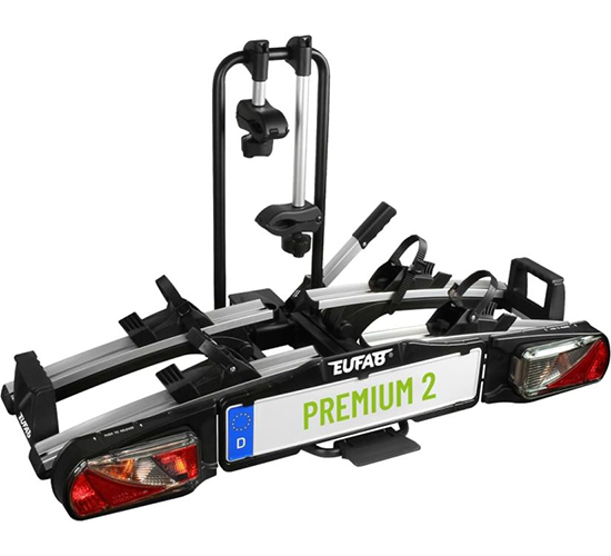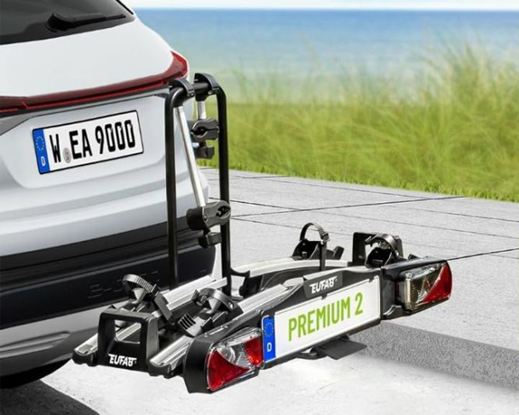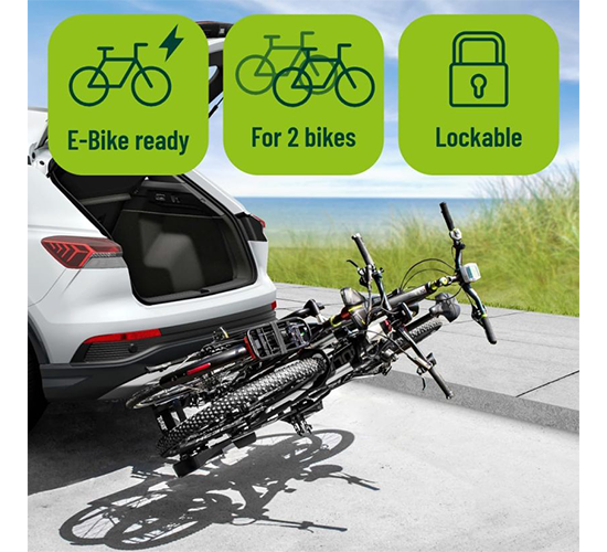 Komplett vormontierter, abschließbarer Fahrradträger für 2 E-Bikes (bis 60 kg). Mit Schnellverschluss, Abklappmechanismus per Fußpedal und Transporttasche. Passt auch für Oversize-/Y-Rahmen (Ø6 cm) und Reifen bis 2,2 Zoll.