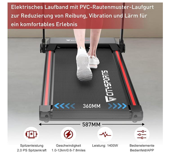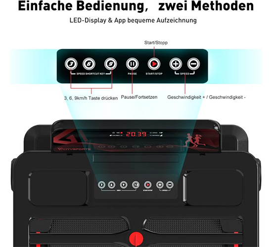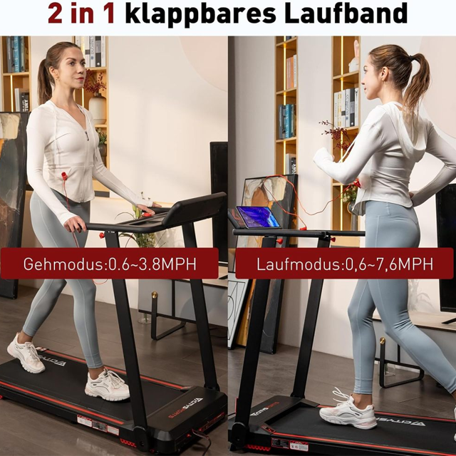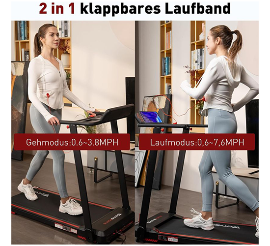 Klappbares Laufband für Zuhause & Büro (bis 12 km/h, 110 kg Belastung). Mit LED-Anzeige, Bluetooth-Lautsprecher & 360° Tablet-Halter. Leiser Motor (1400W), 5-lagiges stoßdämpfendes Laufband & rutschfeste Oberfläche. App-Steuerung für Geschwindigkeit, Distanz & Kalorien. Fertig montiert & platzsparend (nur 26,5 kg).
