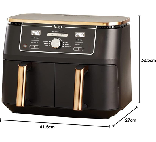 Leistungsstarke 2470-Watt-Heißluftfritteuse mit 2 unabhängigen Kochzonen (je 4,75 L, insgesamt 9,5 L). 6 Funktionen: Air Fry, Rösten, Backen u.v.m. Spart bis zu 65% Energie vs. Backofen. Für fettarme Mahlzeiten (bis zu 75% weniger Fett). Inkl. Crisper-Platten & Rezeptführer. Maße: 27 × 41,5 × 32,5 cm.